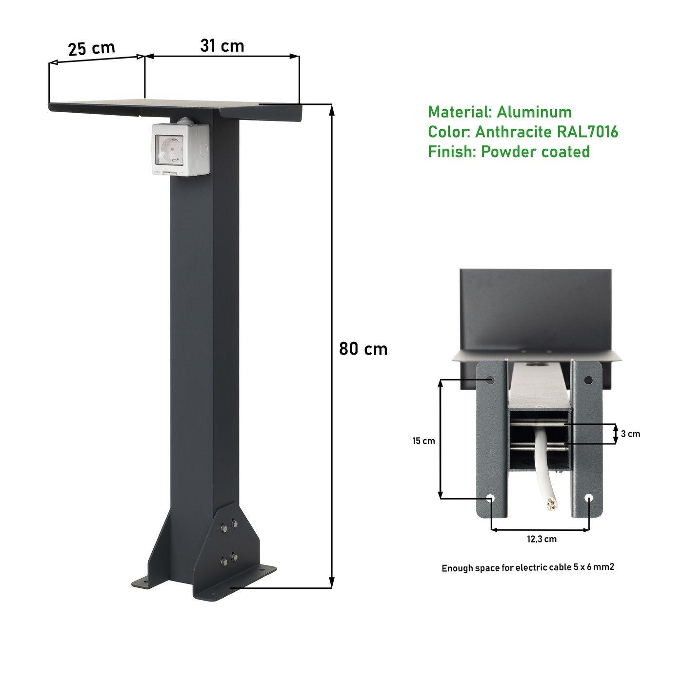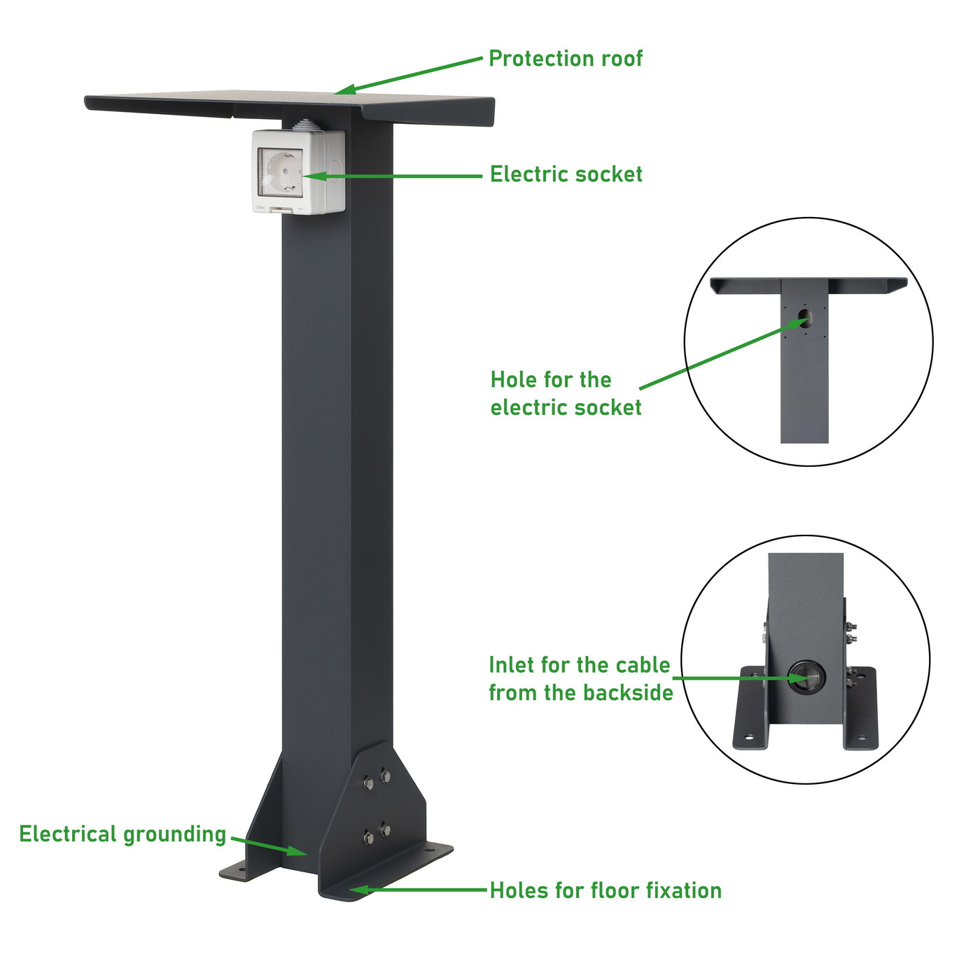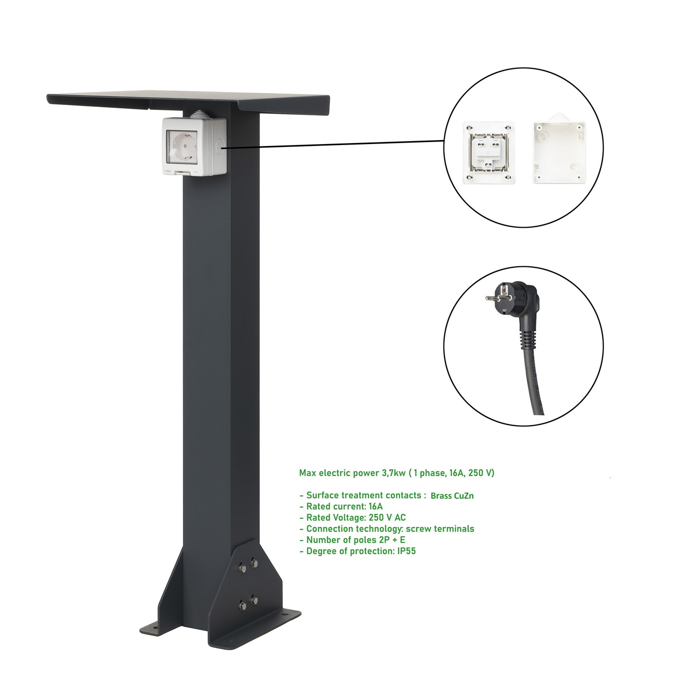 Protezione dagli agenti atmosferici: Il tettuccio in alluminio protegge efficacemente la presa da pioggia e altri agenti atmosferici. La presa è installata a un’altezza di 80 cm, evitando il contatto con eventuali schizzi d’acqua dovuti al rimbalzo della pioggia sul suolo.