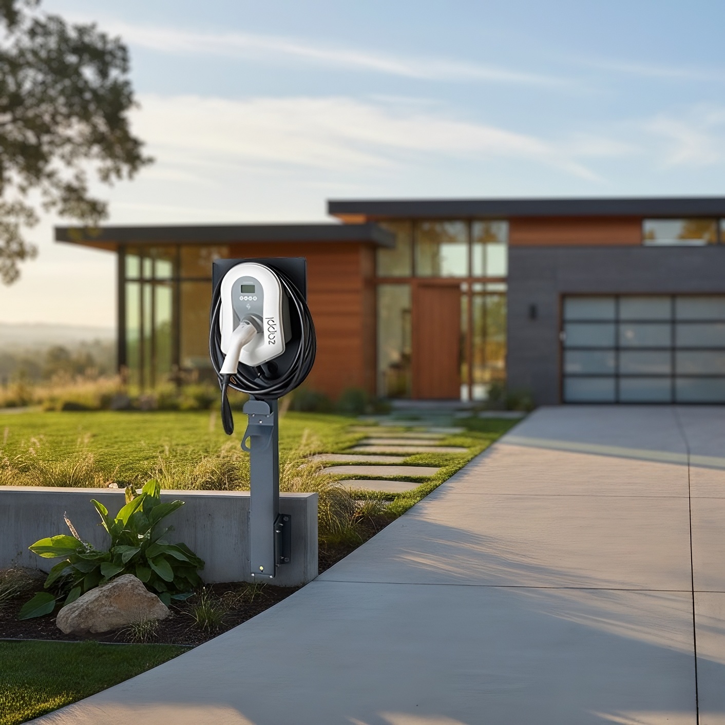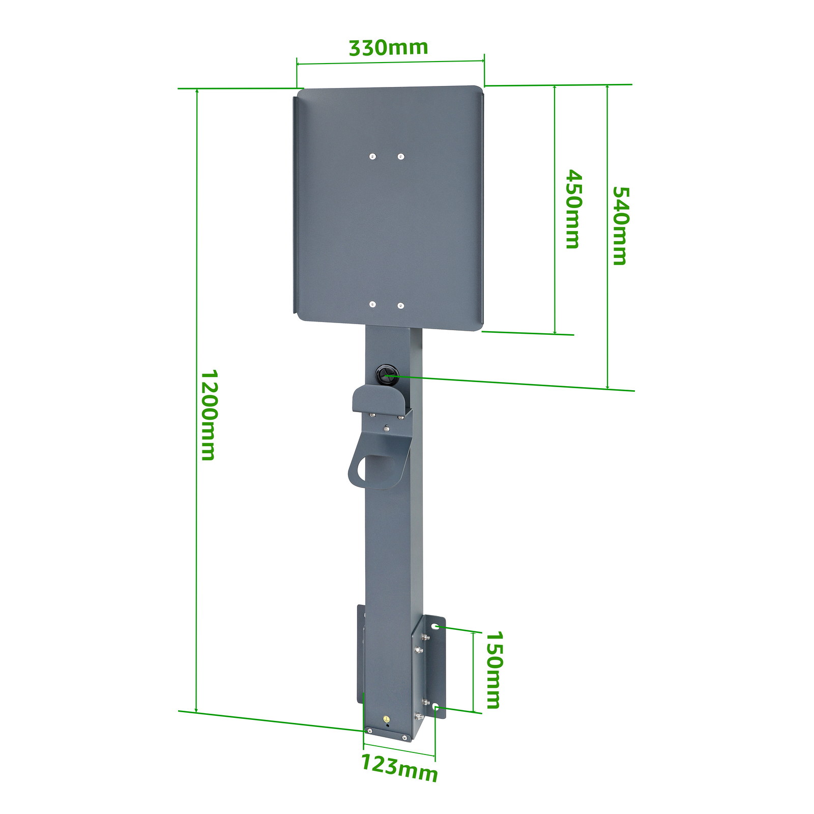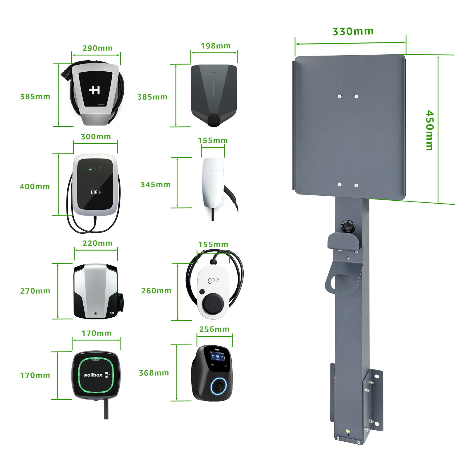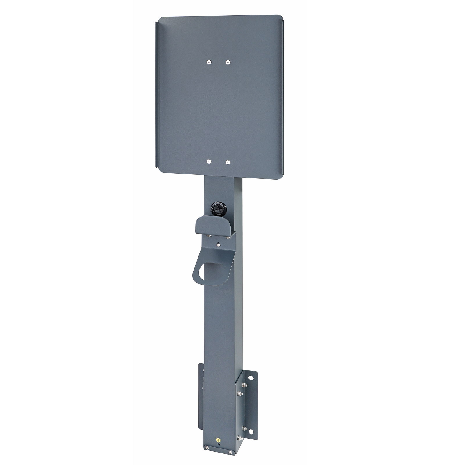 Supporto universale: Adatto al montaggio della maggior parte delle stazioni di ricarica per veicoli elettrici (EV). Dimensioni massime della stazione di ricarica: 45 x 35 cm. La stazione si fissa al supporto nello stesso modo previsto per il montaggio a parete.