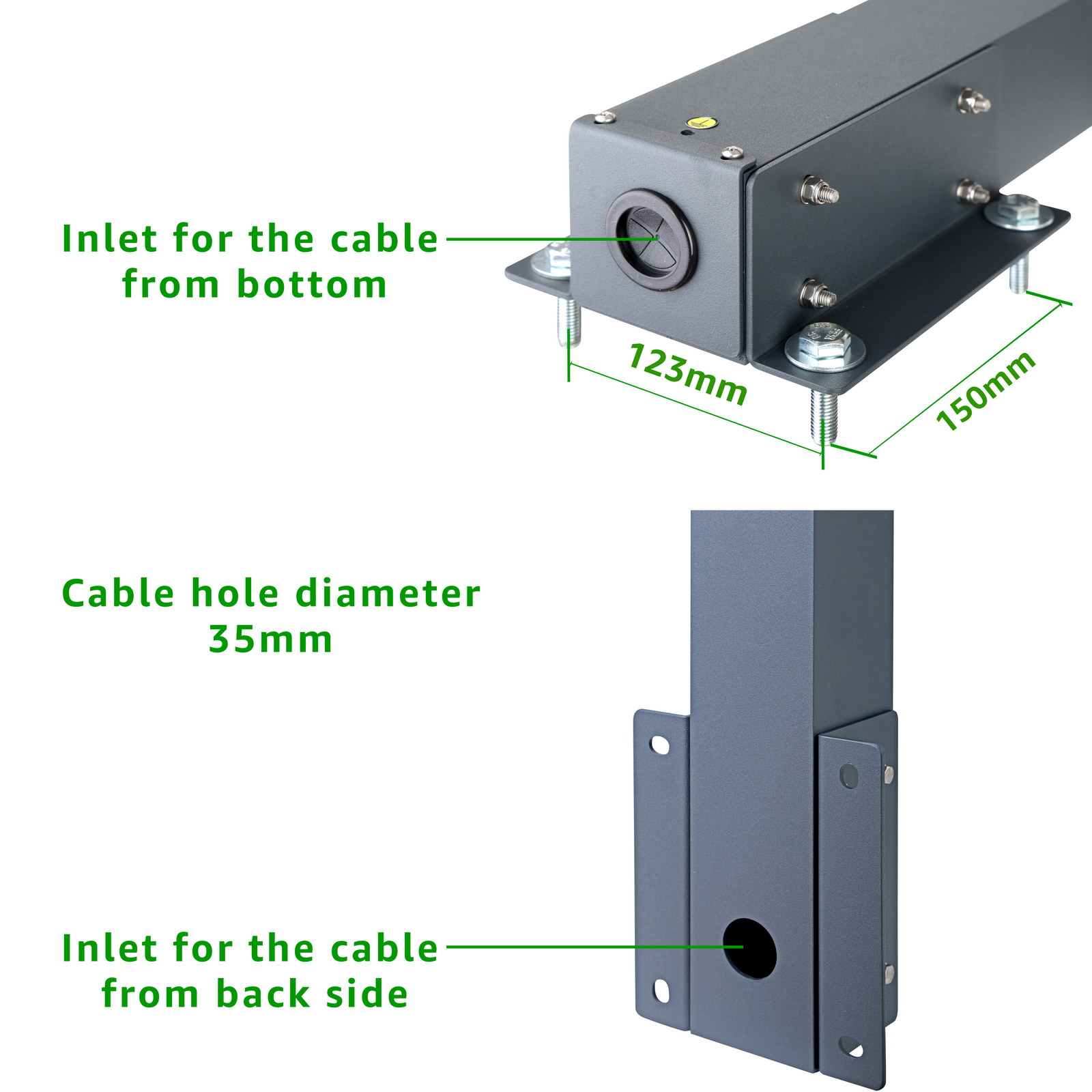 Passaggio dei cavi: Il cavo di alimentazione verso la stazione di ricarica può essere comodamente fatto passare dal basso attraverso un tubo oppure attraverso un foro sul retro del tubo (diametro foro 35 mm).